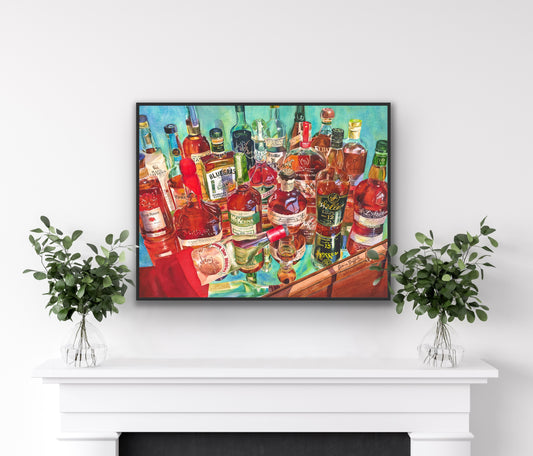 Top Shelf Bourbon Art Print - Whiskey Still Life Watercolor
